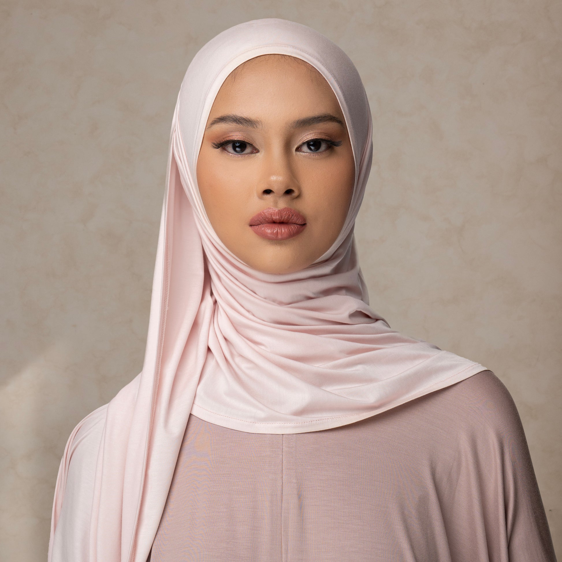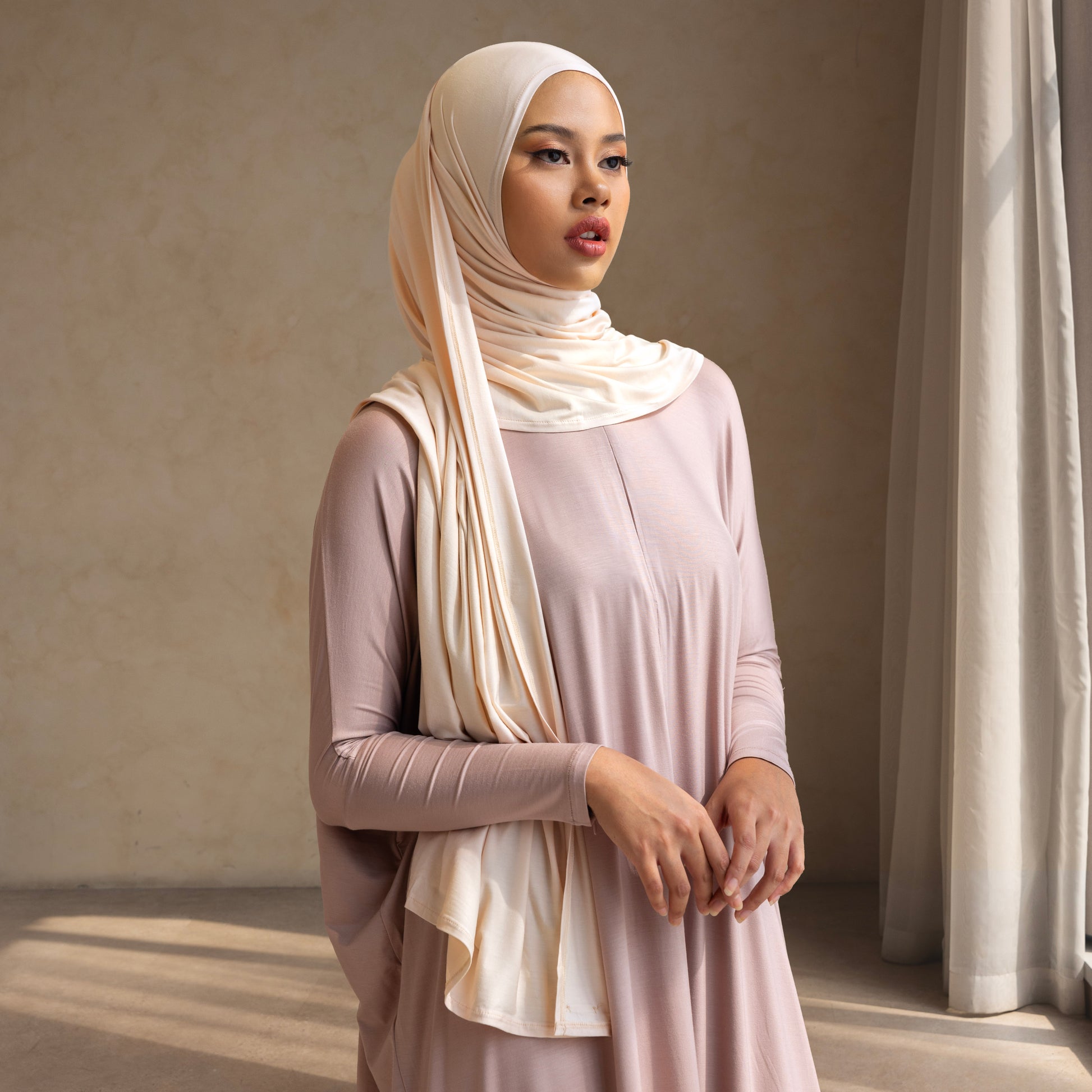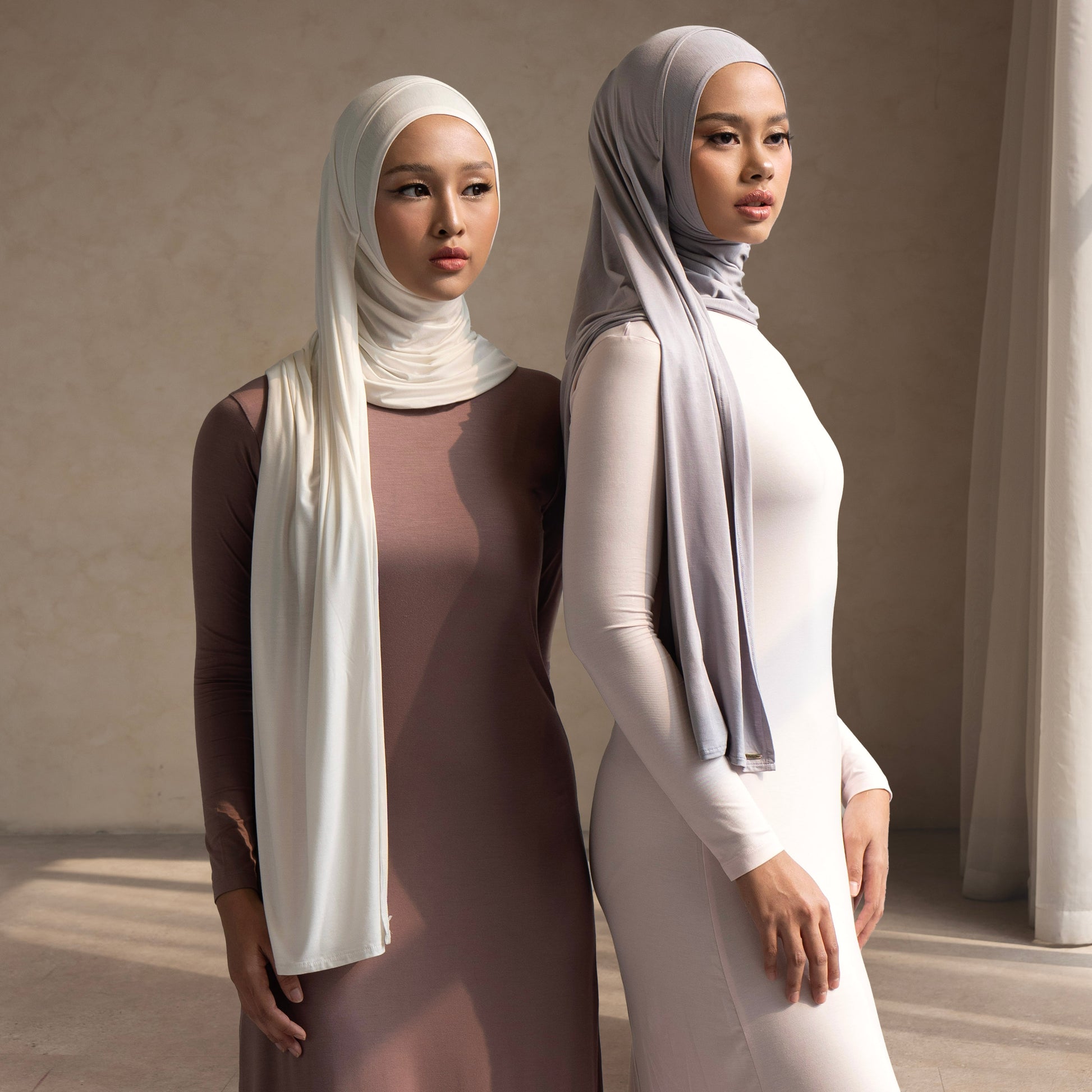 Instant pashmina with an asymmetrical design—longer on the right side and shorter on the left—making it effortless to wear. Simply wrap it around the head to the back, and it's ready to go, without the need for an inner cap. Features an elegant oval shape at the back. Made from an ultra-comfortable, breathable fabric that is lightweight and sweat-resistant. Crafted from premium materials, perfect for hot and humid weather, providing a cooling effect, lightness, softness, and excellent sweat absorption.