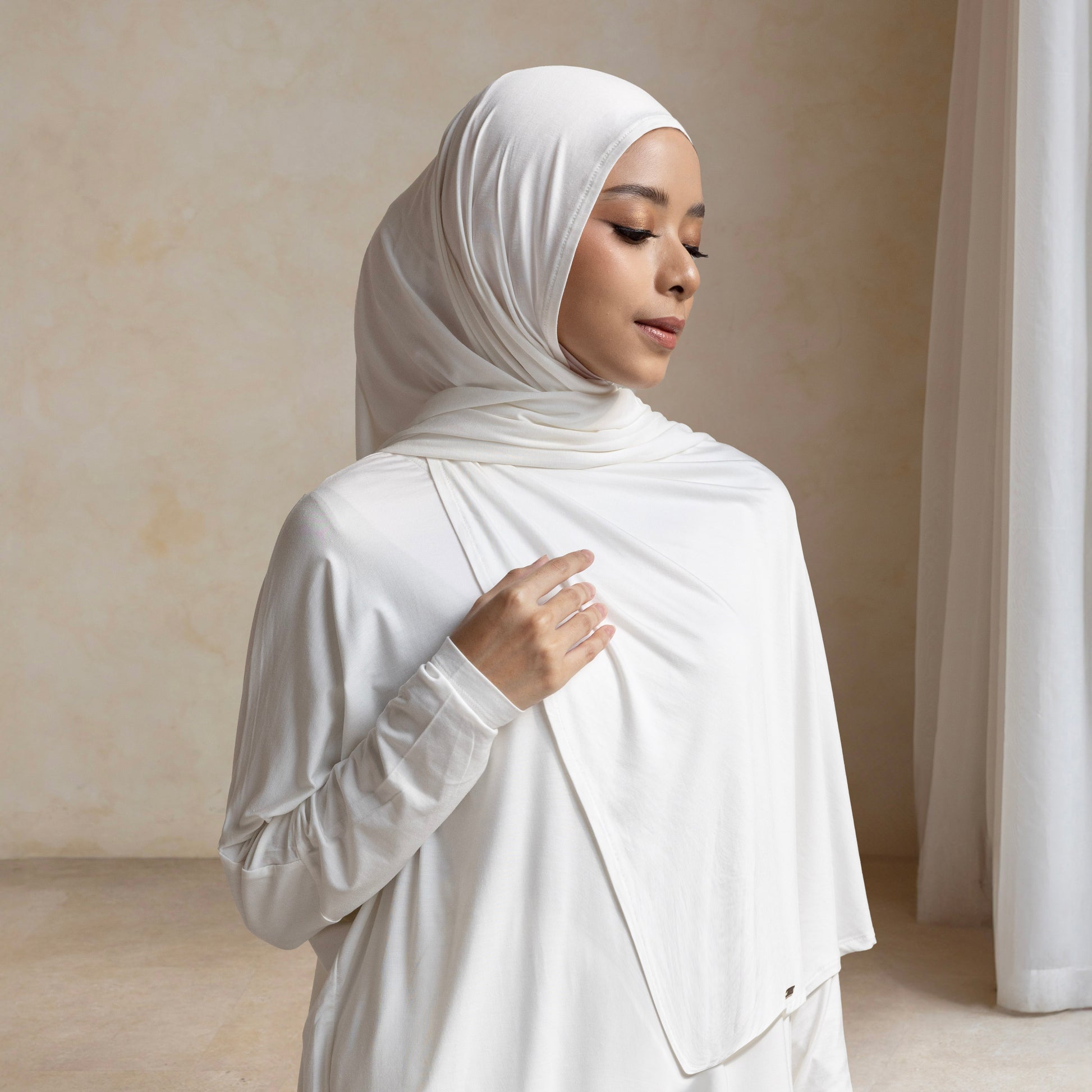 Instant hijab with an attached inner cap and an adjustable tie at the back, allowing for a quicker and more effortless wear. Designed with a front length that provides ample coverage, making it suitable for various styling options. Perfect for those with a busy lifestyle and high daily activities.